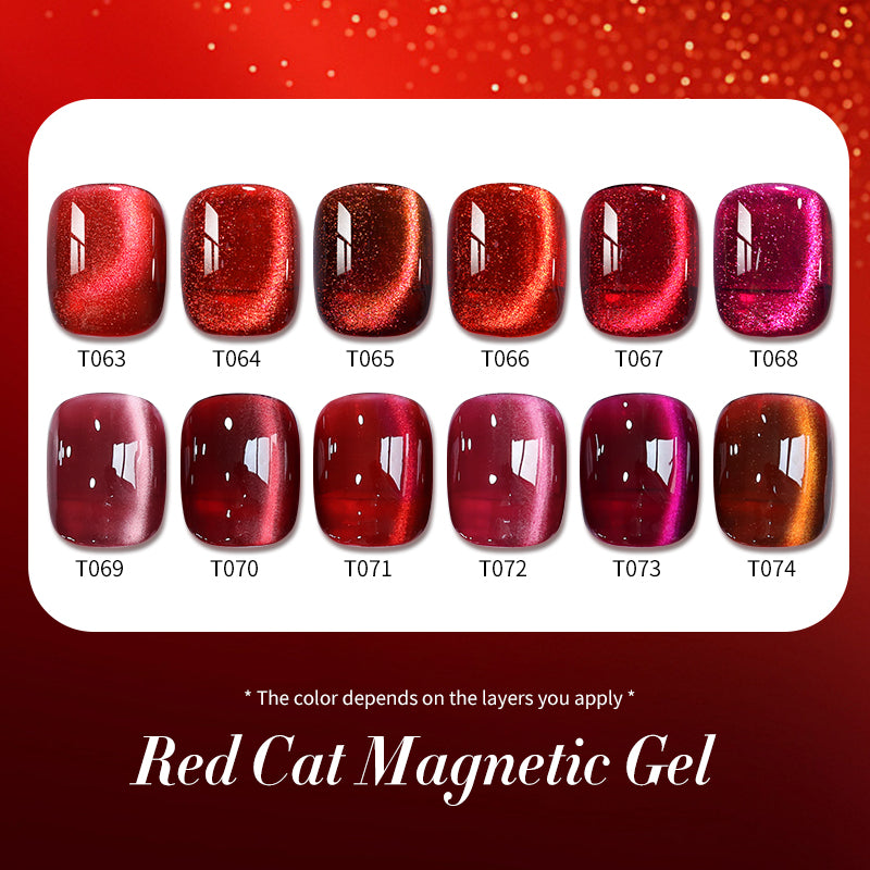 Descubre nuestra colección Red Cat Magnetic Gel, una gama de tonos rojos profundos y vibrantes con efecto magnético que crea reflejos luminosos y efectos tipo terciopelo, galaxia o corazón con imán.
