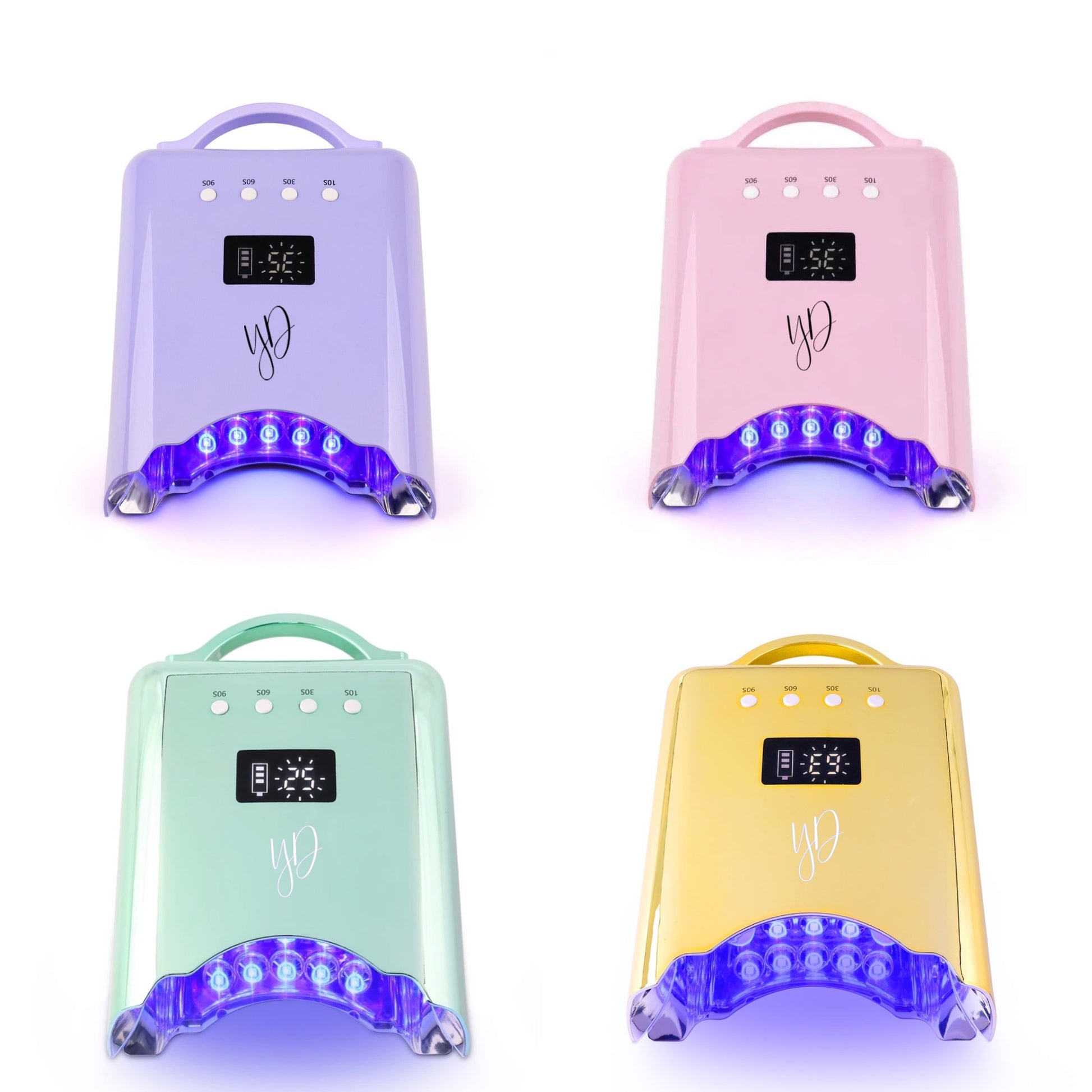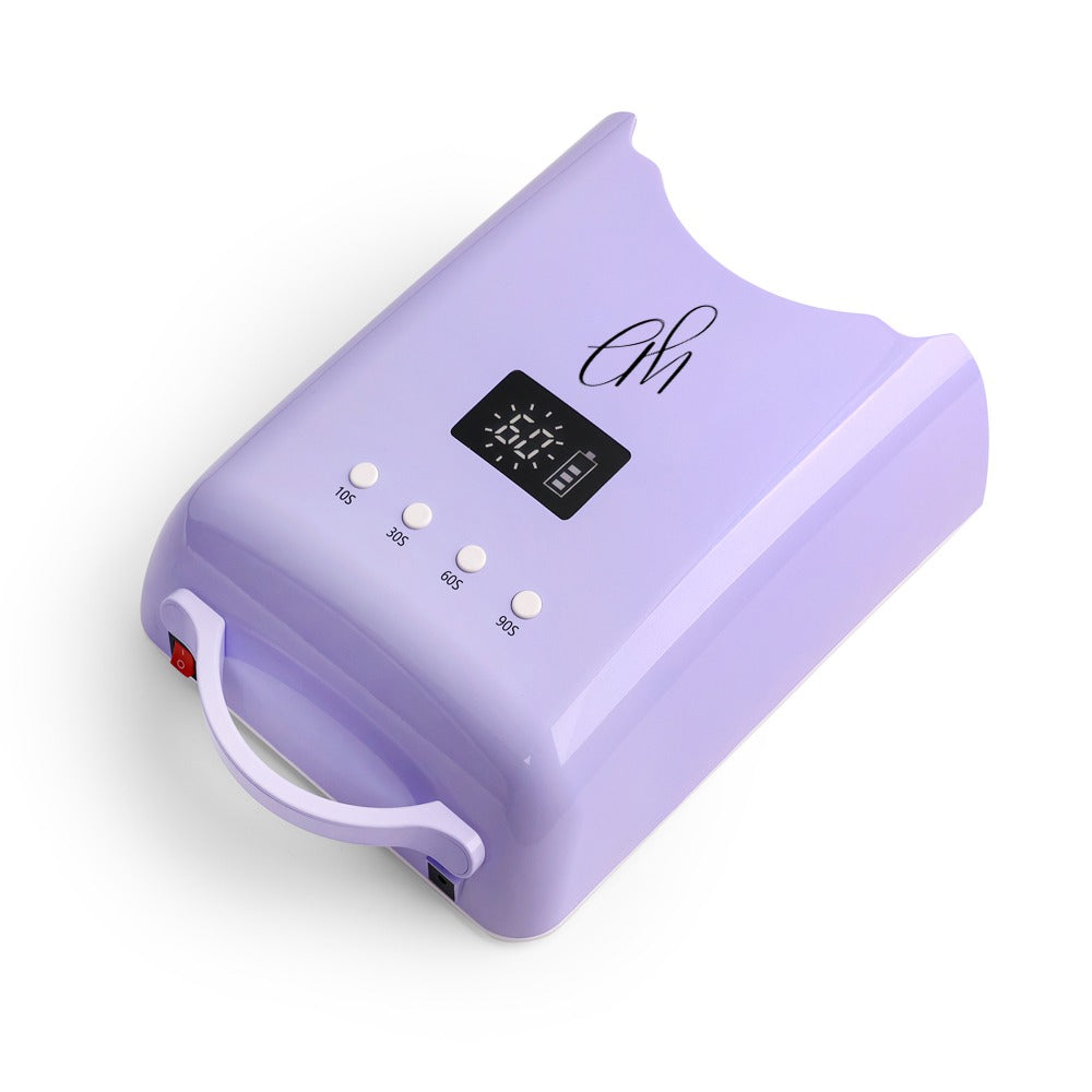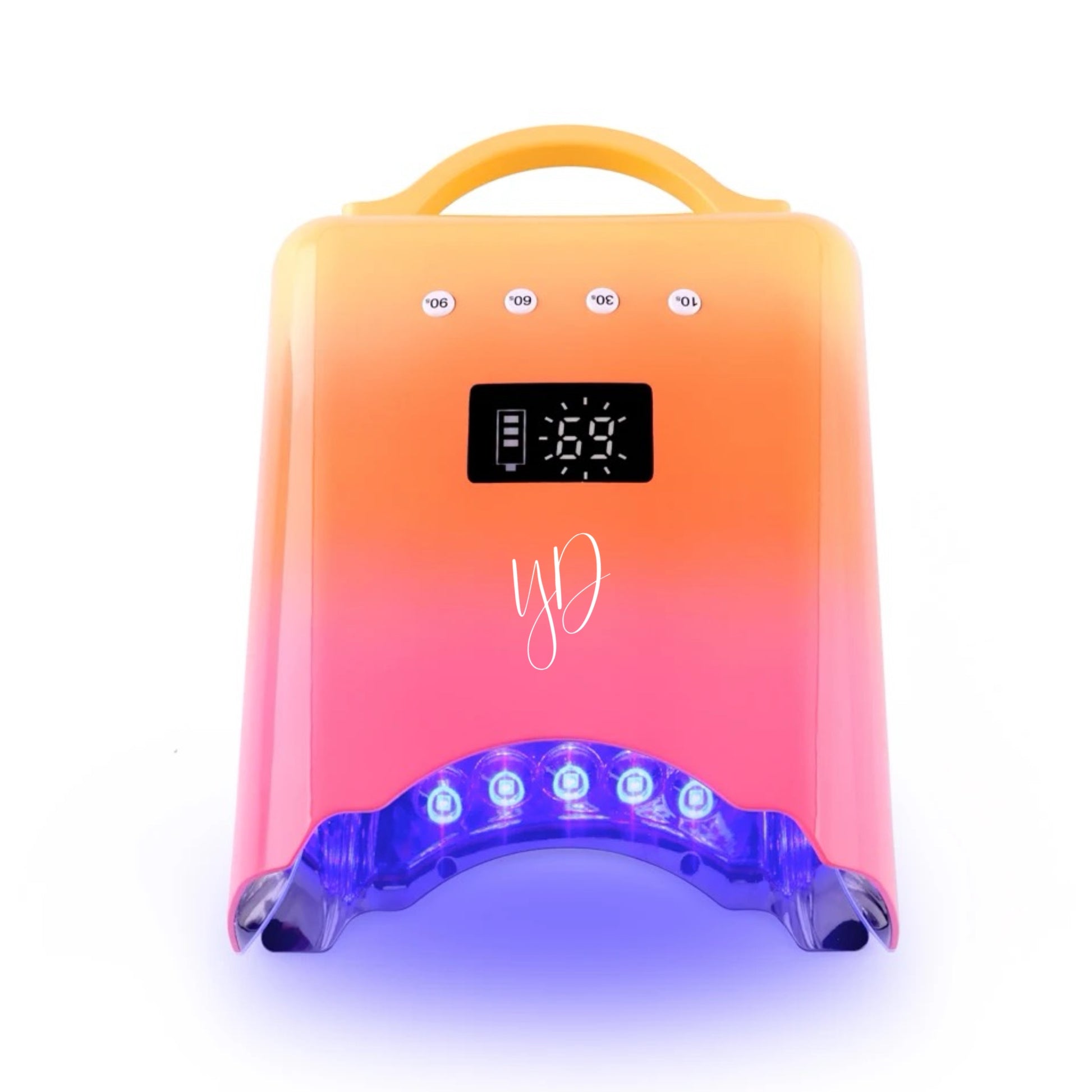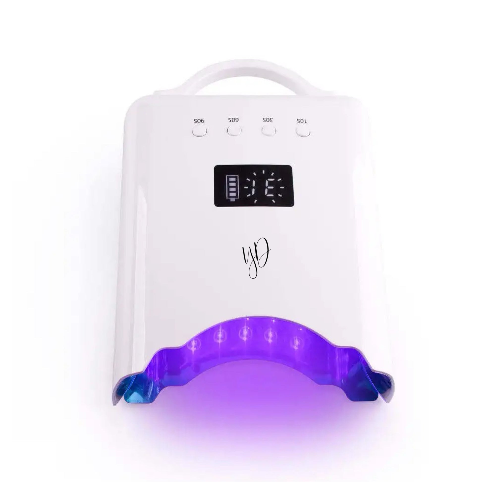 Lámpara híbrida (uv/led), con tecnología UV/LED, 42 bombillas, 78wats, recargable, se puede utilizar con el cable conectado y sin el, efecto espejo para un curado más uniforme, base removible en acero inoxidable con imán para fácil desprendimiento. Ocupa muy poco espacio en la mesa, pantalla completamente digital, 10s, 30S, 60S, 90s